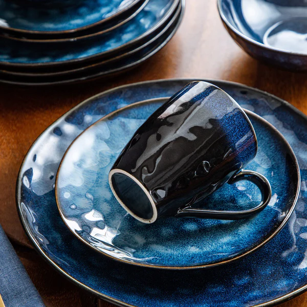 Chaque pièce est réalisée en grès portugais de haute qualité, avec un émail bleu profond qui allie design artisanal, robustesse et élégance. Compatible lave-vaisselle et micro-ondes, parfait pour un usage quotidien ou pour des repas de fête.